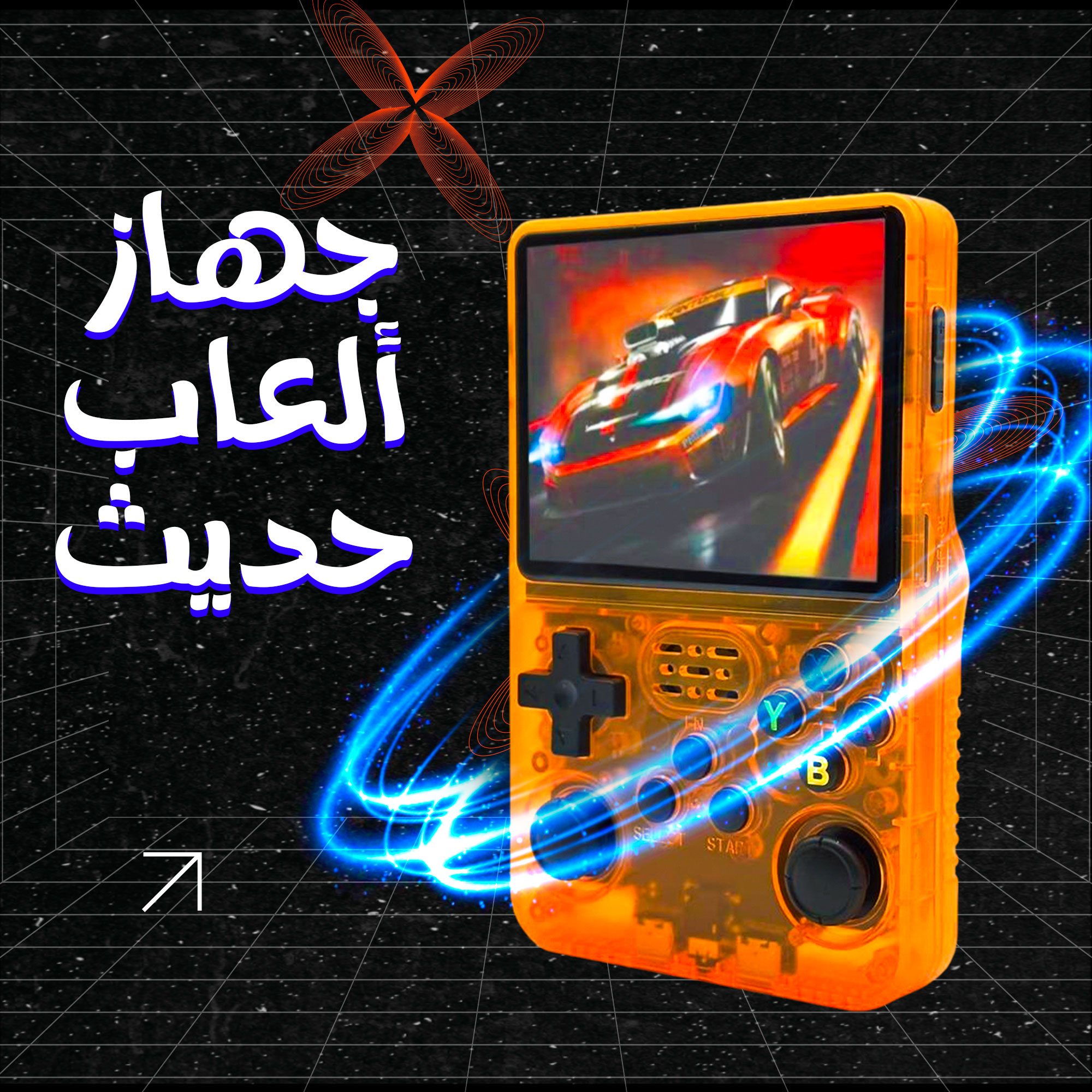 جهاز R36S: اشحنه كامل قبل الاستخدام، اختر اللعبة من القائمة، استخدم الأزرار للعب، وللسماعة أو الشحن استخدم منفذ Type-C.